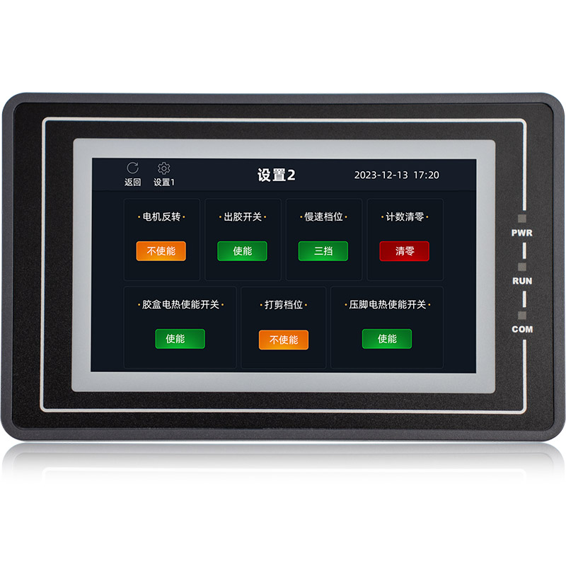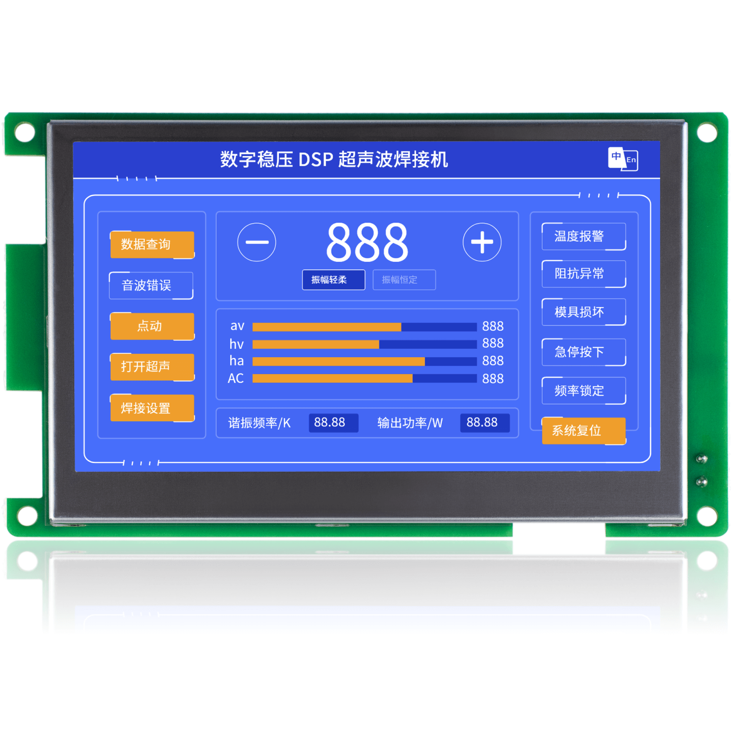 金璽HMI應(yīng)用在超聲波控制上,安裝在控制機箱上對超聲波進行數(shù)據(jù)設(shè)定和監(jiān)控。
